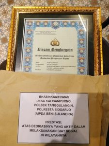 SIDOARJO, GELORAJATIM.COM – Personil Polsek Tanggulangin Bhabinkamtibmas Desa Kalisampurno kembali terpilih dan menerima penghargaan Bhabinkamtibmas yang aktif dalam keseharian bertugas dan berbaur dengan masyarakat. Yang mana dilingkup area per Kecamatan atau di lingkup pemerintahan desa pasti memiliki Bhabinkamtibmas atau Babinsa