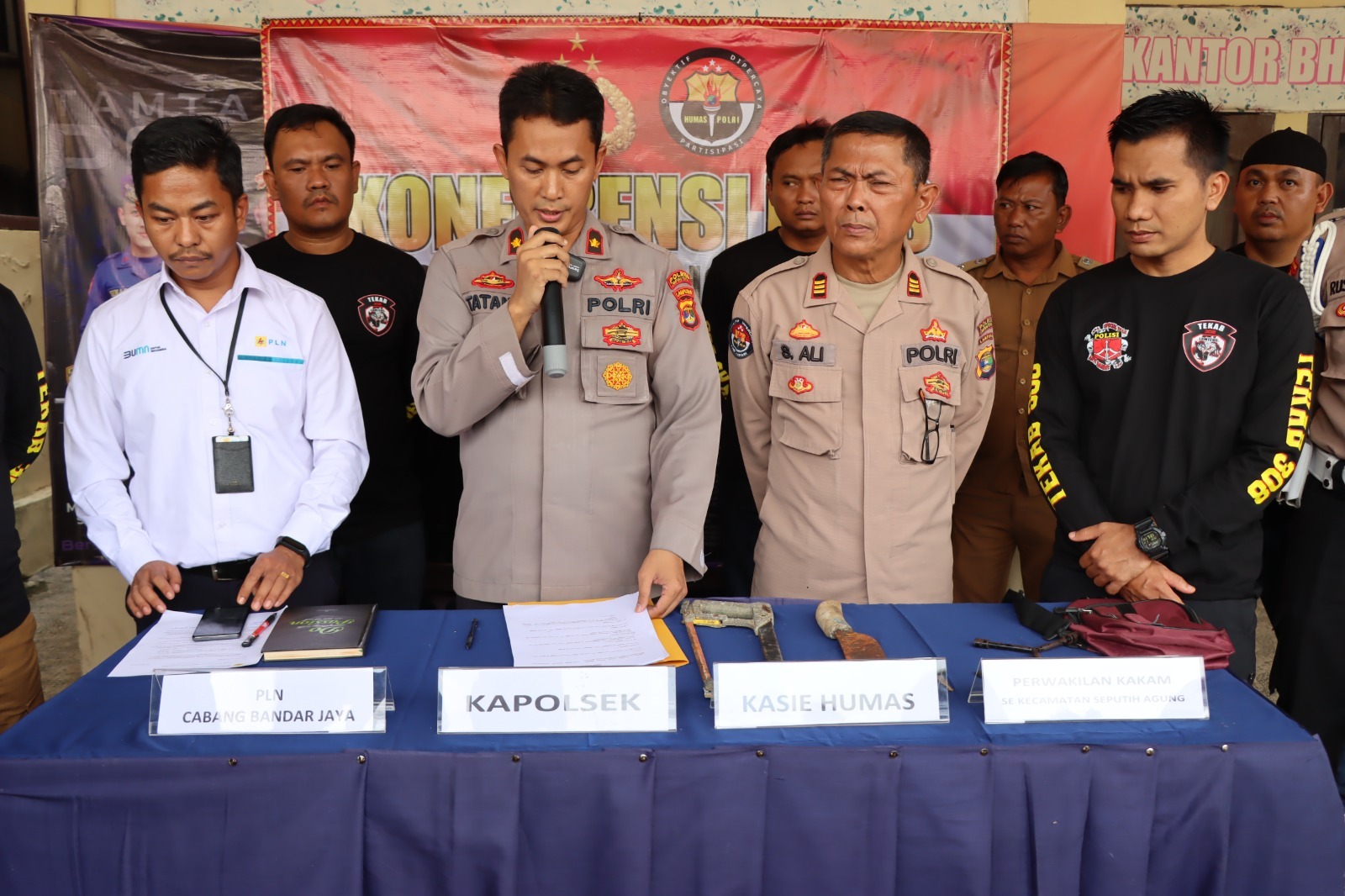 LAMPUNG TENGAH, GELORAJATIM.COM – Kapolsek Terbanggi Besar Kompol Tatang Maulana mewakili Kapolres Lampung Tengah AKBP Doffie Fahlevi Sanjaya, S.I.K.,M.Si didampingi Kasi Humas AKP Sayidina Ali, Kanit 1 Reskrim Polsek Tebas Ipda Rommy Dwibowo, perwakilan dari pihak PLN serta perwakilan Kepala Kampung. Menggelar Konferensi Pers terkait ungkap 3 kasus kejahatan, mulai dari kasus Curanmor, pencurian Kabel MVTIC milik PLN sepanjang 550 meter dan kasus penggelapan. Senin (13/3/2023).