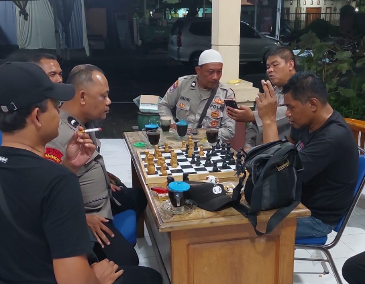 Tak ingin ketinggalan informasi penghitungan suara Pilpres/Caleg, personil Polsek Tanggulangin PAM Harkamtibmas di pendopo Kecamatan Tanggulangin sambil bermain catur agar tidak bosan dan jenuh saat memantau hasil penghitungan kotak suara yang masuk ke Kecamatan Tanggulangin.