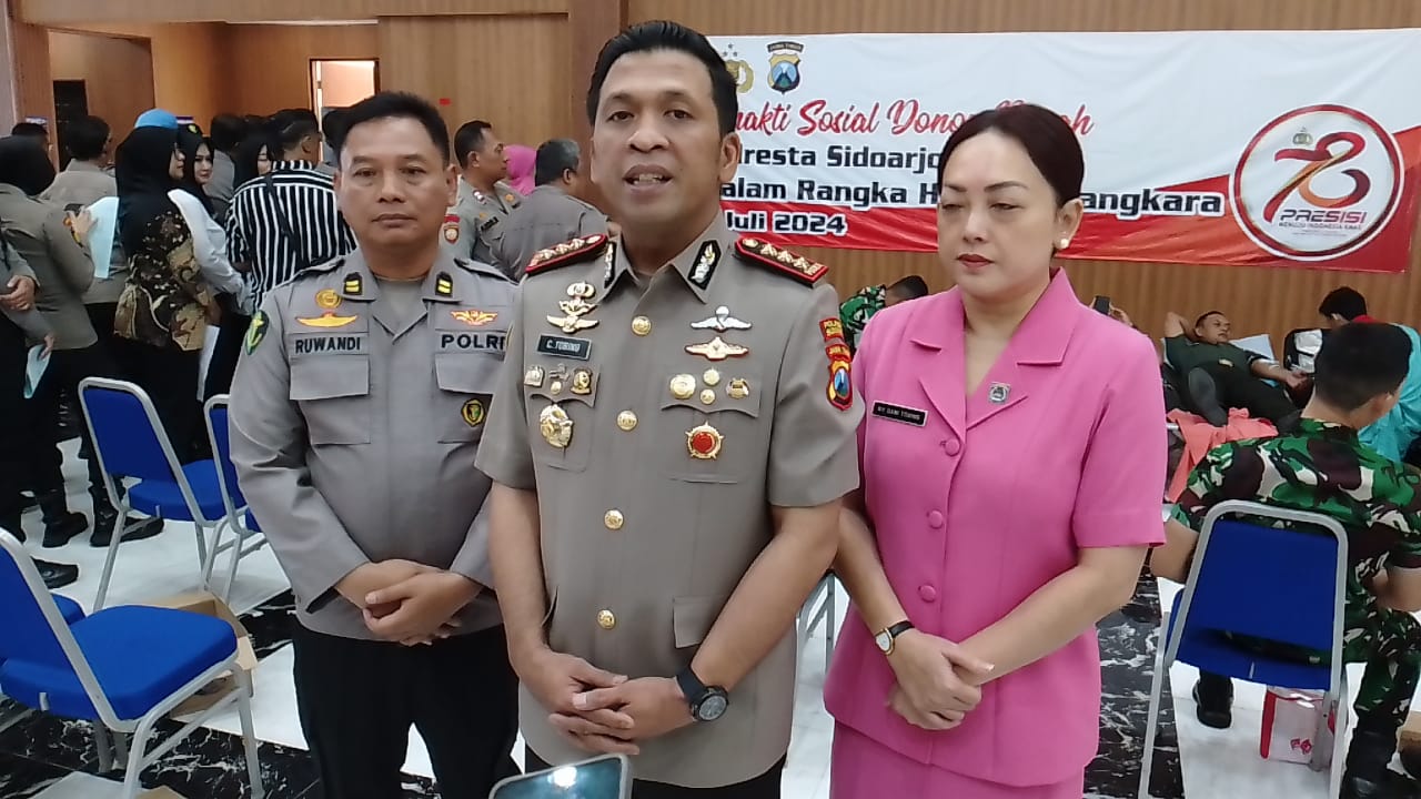 Kapolresta Sidoarjo Kombes Pol Christian Tobing SIK, MH, M.si, didampingi Ketua Bhayangkari Polresta Sidoarjo dan Kaur Kes Polresta Sidoarjo Iptu Ruwandi SH menjelaskan, dalam rangka menyambut HUT Bhayangkara ke 78 Polresta Sidoarjo bersama rekan rekan personel, TNI, ASN, dan Satpol PP Kabupaten Sidoarjo telah berbondong bondong mengikuti donor darah secara serentak.